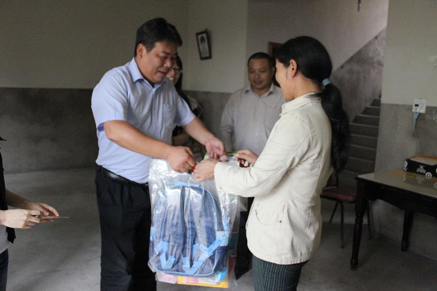 圖為濱海供水公司代表為馬鞍鎮結對貧困兒童送去書包的慰問品及慰問金