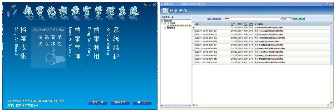 今年年初以來,在縣檔案局指導(dǎo)下,濱海供水公司檔案工作有了較大提高,數(shù)字檔案室建設(shè)基礎(chǔ)良好,軟、硬件條件完善,達(dá)到檔案信息數(shù)字化標(biāo)準(zhǔn)。目前,檔案室建有文書、會計(jì)、用戶、工程、人事、設(shè)備、聲像等7大類電子檔案數(shù)據(jù)庫及供水管網(wǎng)信息、綜合水供水信息、小舜江供水信息、綜合水用戶信息、大事記、組織機(jī)構(gòu)沿革等6個(gè)專題數(shù)據(jù)庫,歸檔電子文件達(dá)20995件。同時(shí),開通電子檔案信息查詢平臺,并與辦公自動(dòng)化系統(tǒng)實(shí)現(xiàn)聯(lián)通,可隨時(shí)訪問利用電子檔案信息,進(jìn)一步提升了供水信息化程度,提高了檔案服務(wù)能力。