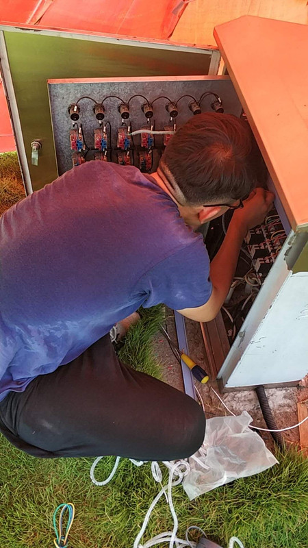 排水公司的自控維修人員在將近40℃的高溫下安裝自控設備,調試各項參數。