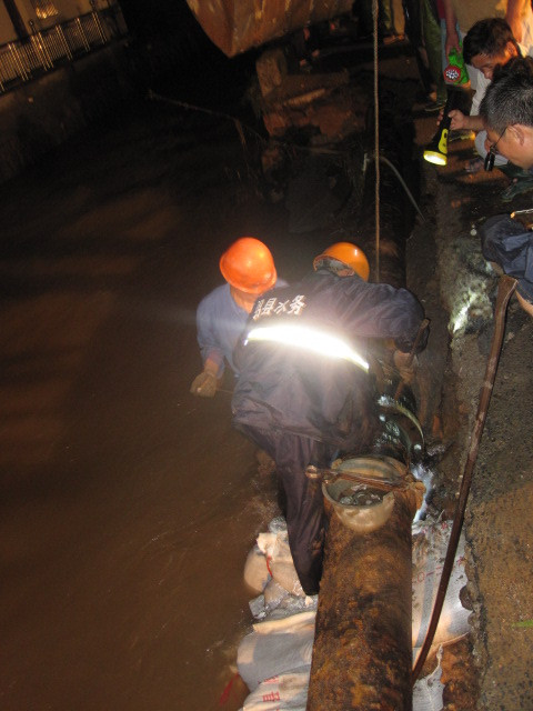 21點10分,搶險準備工作全部完畢,供水管道搶修工作正式開始。搶險隊員分成兩隊實施搶修,在不到6米寬的狹長道路上,搶險隊員在被湍急洪水沖刷掏空的路基上,冒著隨時坍塌的危險,全然不顧個人安危沖鋒在前,狂風大雨下,突擊隊只有一個信念:就是要搶時間,趕進度,盡快讓全鎮(zhèn)百姓第二天能正常用水!