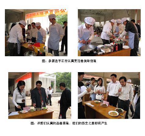 廚藝比賽按部門分為8個小組,每組由4人組成,而參賽都是35周歲以下青年員工。按規則各組選手均要在規定的時間內完成了比賽所定的一冷菜、二小炒、一煲湯四樣菜式。較往屆此次比賽多了一項規定金額自選購菜,使參賽小組烹飪的菜肴更具選擇性與特色化。