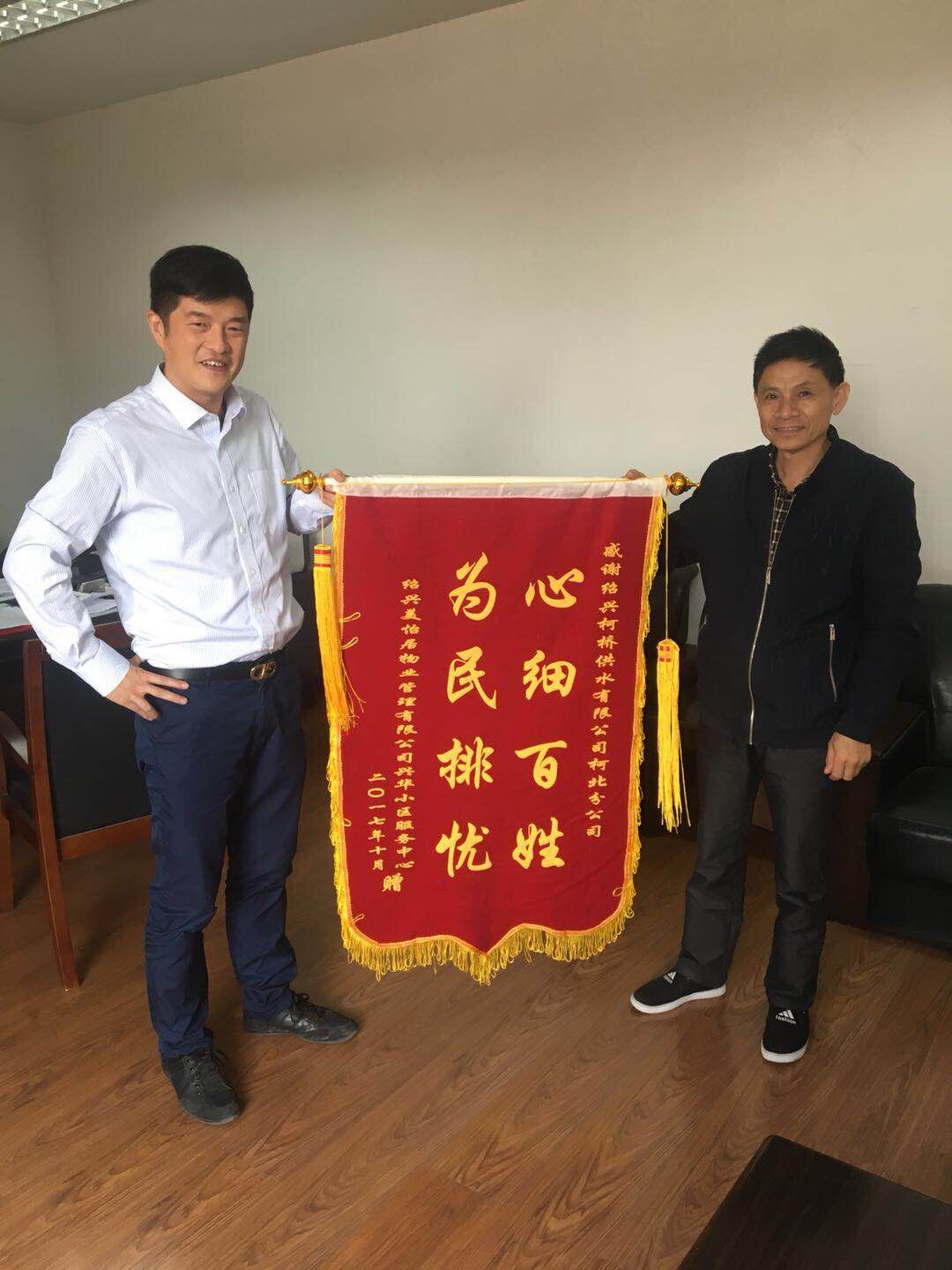 1024日,華舍街道紹興美怡居物業管理有限公司興華小區服務中心負責人專程送來錦旗,感謝柯北分公司向他們提供優質高效的服務。