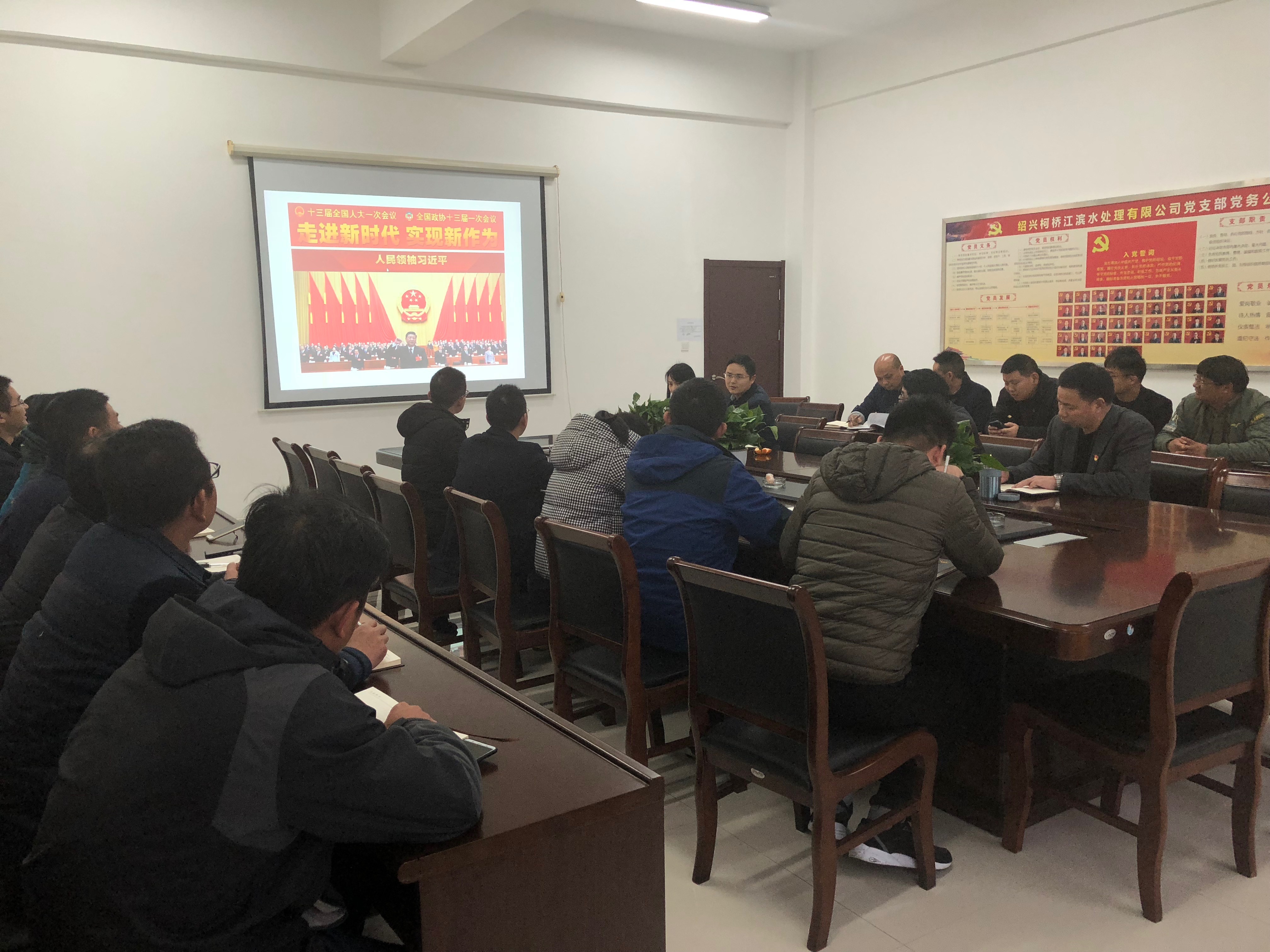公司黨支部組織全體在職黨員專題學習黨的十九屆二中全會精神。